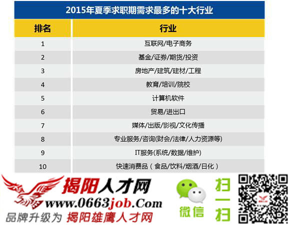 圖為2015年夏季求職需求最多的十大行業(yè),換句話講就是這些行業(yè)的發(fā)展勢(shì)頭較猛,屬于朝陽(yáng)行業(yè),需要更多優(yōu)秀人才。相信大部分人都希望可以進(jìn)入一個(gè)朝陽(yáng)的行業(yè),在風(fēng)口行業(yè)工作比在夕陽(yáng)行業(yè)中努力更容易獲得成功。