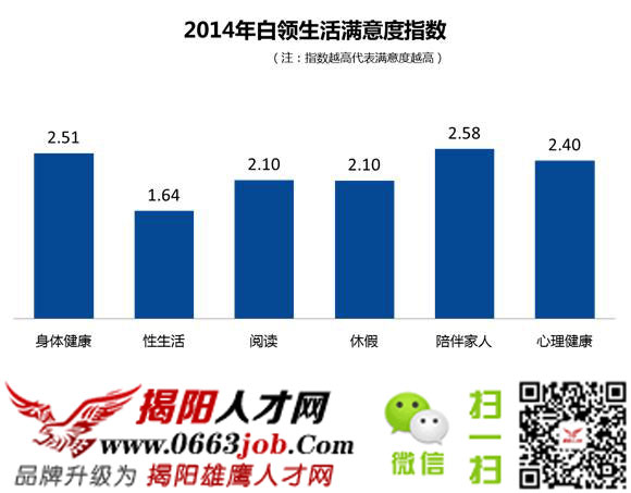 圖為2014年中國(guó)白領(lǐng)生活滿意度,中國(guó)白領(lǐng)最不滿意的是性生活,滿意度僅為1.64。過(guò)半中國(guó)白領(lǐng)每月性生活次數(shù)低于1次,其中,46.1%為單身;僅有約1/4的中國(guó)白領(lǐng)每周至少過(guò)1次性生活。加班、工作壓力較大、出差較多的工作有可能會(huì)導(dǎo)致陪伴家人/伴侶的時(shí)間大大減少,這也是需要大家考慮的因素之一。